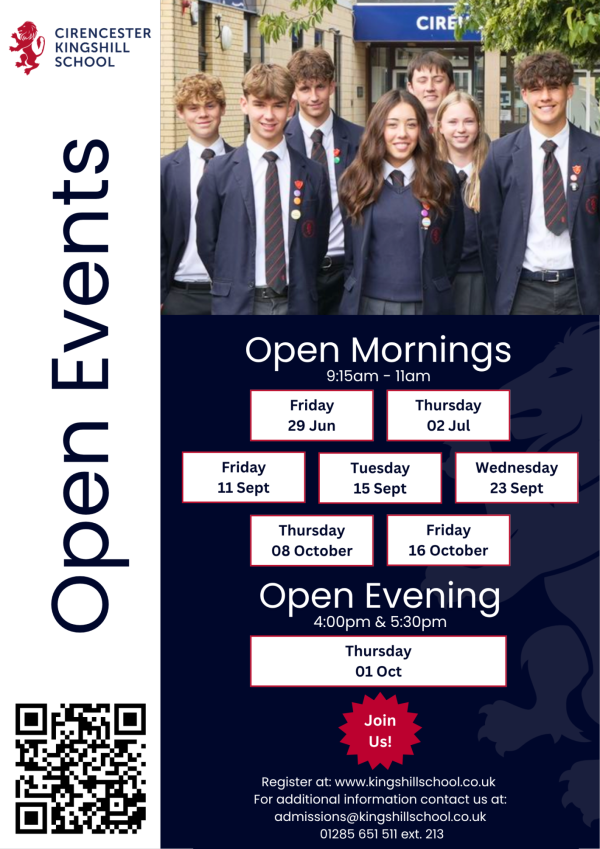 Choosing the right secondary school is an important decision, and at Kingshill we are committed to providing a nurturing, inspiring environment where every child can flourish. Our upcoming Open Mornings and Open Evening are the perfect opportunity to experience the heart of our school. You will have the chance to meet our dedicated staff, talk with our students, and see first-hand the wide range of opportunities we offer—both in the classroom and beyond.