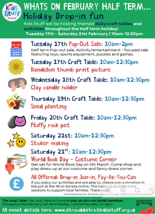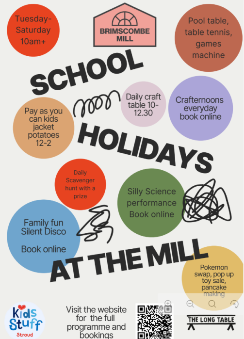 Brimscombe Mill: www.brimscombemill.org.uk/school-holidays (brimscombemill.org.uk in Bing) Kids Stuff Stroud: www.strouddistrictkidsstuff.org.uk/activities (strouddistrictkidsstuff.org.uk in Bing)