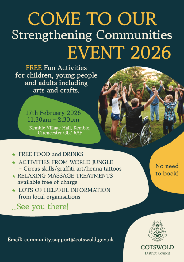 All families, carers and grandparents are invited to a free half‑term event at Kemble Village Hall. Activities include mini massages, henna tattoos, circus skills and crafts, plus free food and drinks.